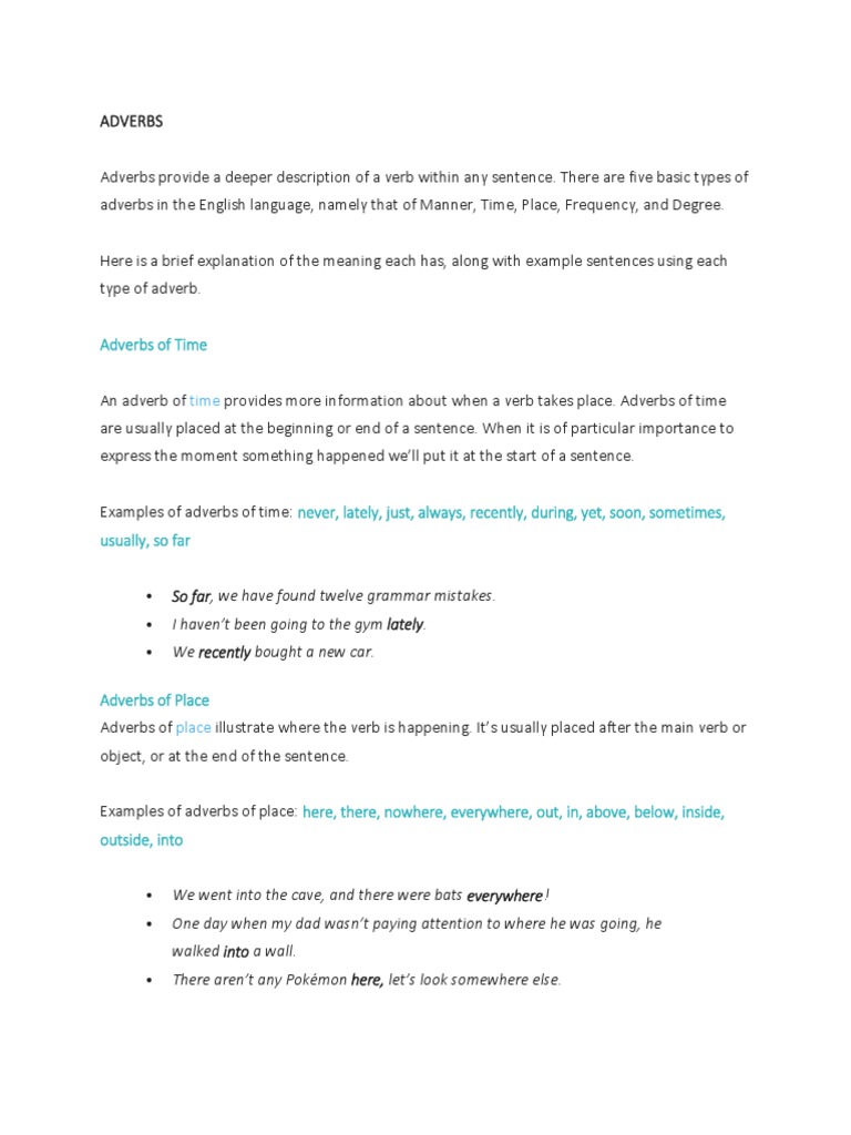 Adverbs of manner usually answer questions of how. An adverb phrase consists of an adverb plus any modifiers. An adverb is a word that modifies verbs, adjectives and other adverbs. She completed her work nicely. He played the harpsichord badly, or. When there is more than one any time that you want to describe somebody's action, for example: Japanese, afrikaans, dutch, mandarin, and german belong to this category. All things considered, adverbs are common parts of speech and sentence structure. Adverbs of manner, place and time usually come in end position: Please do not post your comments in more than one place. For example, it is incorrect to native speakers use collocations all the time. For example he ran doesn't say much about how he ran. They're often placed directly before the main verb of a sentence.